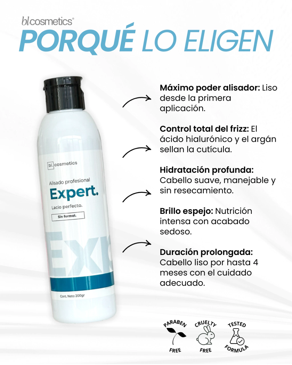 Su innovadora composición logra un lacio duradero, suave y con brillo intenso, sin dañar la fibra capilar. Además, reduce notablemente el frizz y deja el cabello con movimiento natural.