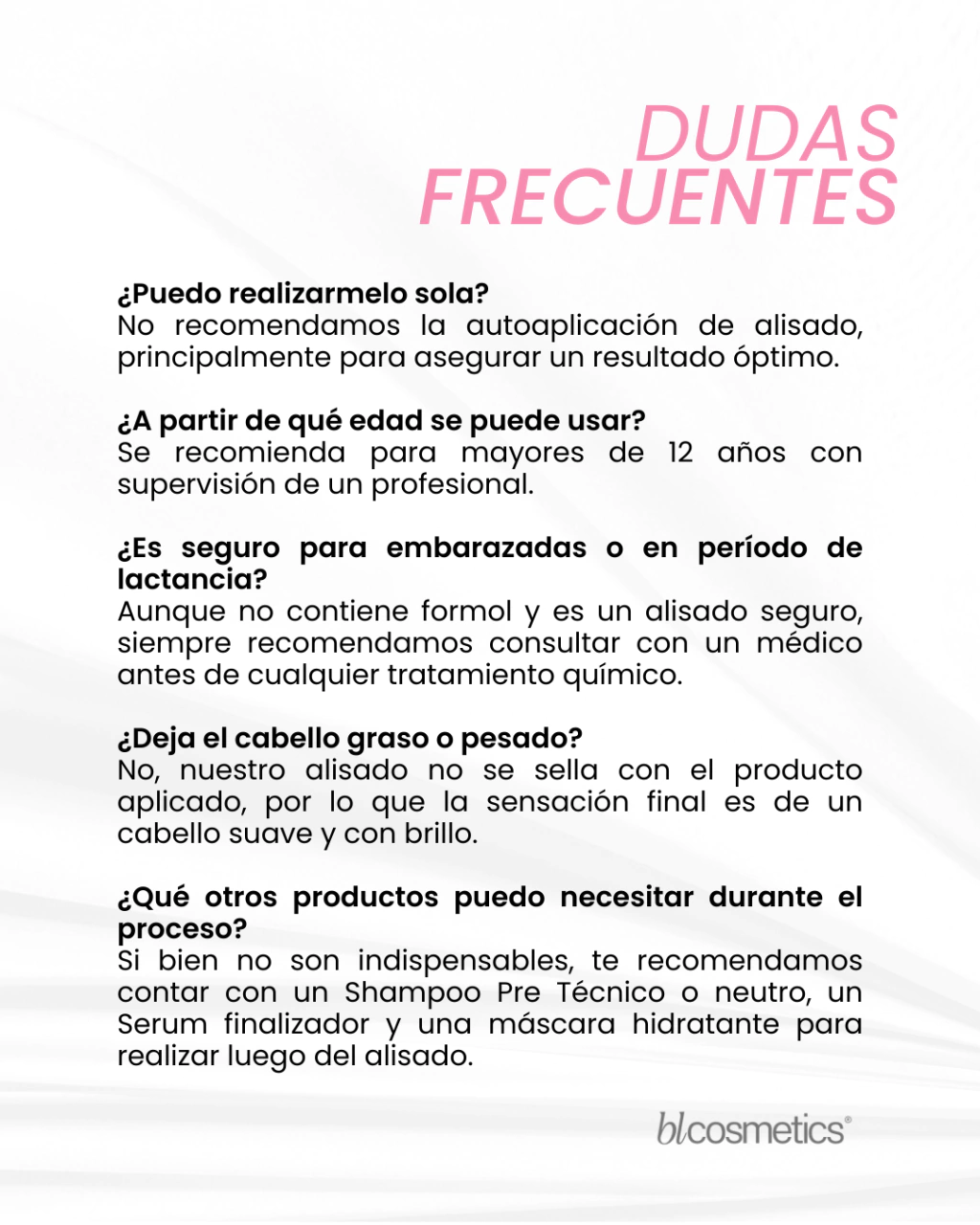 Cada producto trae las indicaciones de uso en su etiqueta para que puedas aprovechar al máximo el producto. Para utilizar el alisado es necesaria una planchita que llegue a 230C, este paso va a asegurar el porcentaje de lacio obtenido.